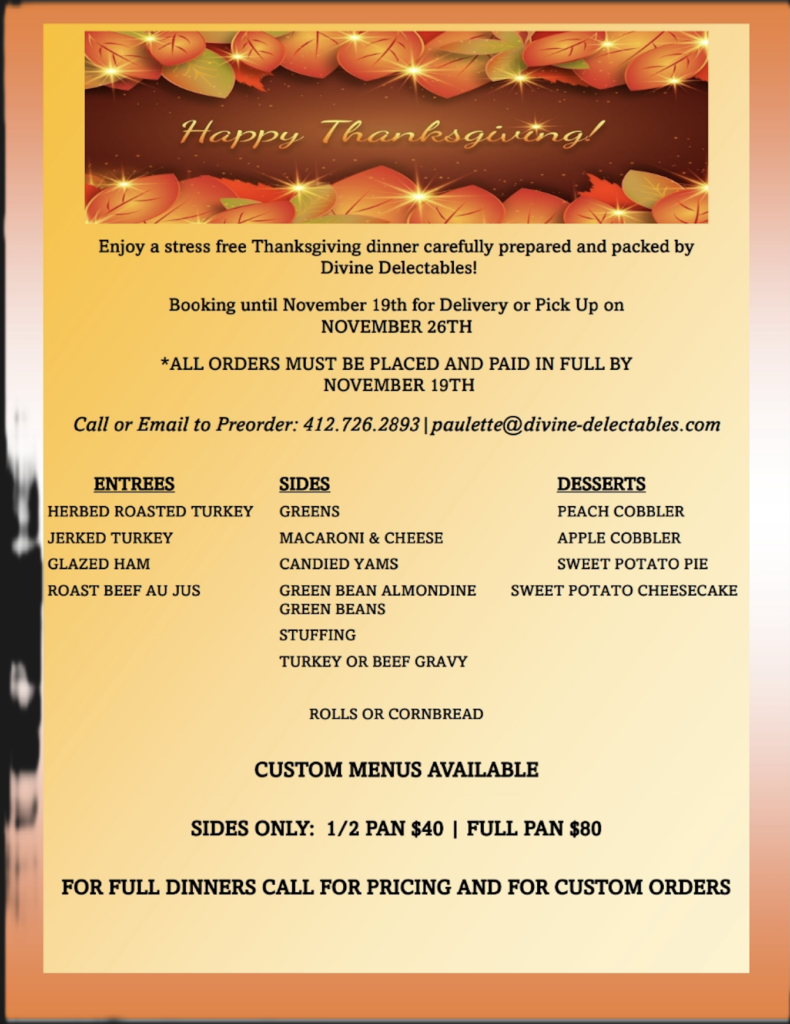 Fried Chicken, Baked Chicken, BBQ Chicken, BBQ Ribs, Shrimp Primavera, Baked Penne Pasta w/Turkey Sausage, Stuffed Shells, Seafood Lasagna, Pecan Crusted Catfish w/White Cheddar Grits, Glazed Chicken Kabobs, Jerk Ribs, Rice Stuffed Flounder, Crab Shells, Spinach Lasagna, Baked Ham, Italian Style Orange Roughy, Roast Beef Au Jus, Bourbon Pecan Chicken, Apple Filled Chicken w/Pecan Cream Sauce, Beef Wellington, Fettuccine w/Salmon Sauce, Apricot Glazed Chicken